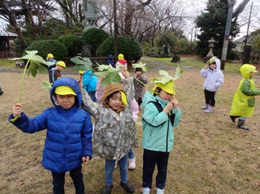 ひまわり組は、大きな葉っぱを傘代わりにお散歩中。