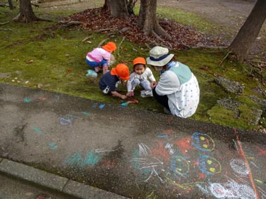 園庭ではチョークでダイナミックな落書き。子どもたちの顔も楽しそうです。