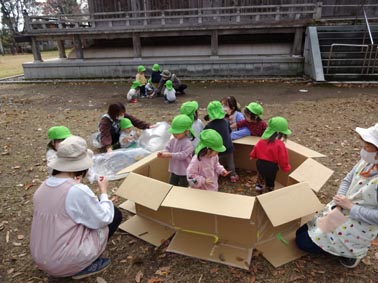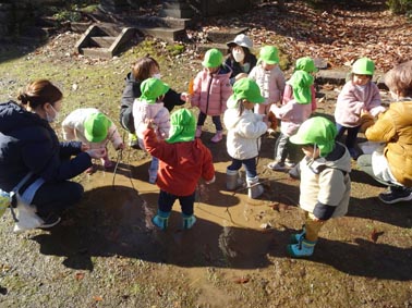 昨日の大雨で境内では、大きな水たまりが。その中へ木を入れて、釣りを楽しむつくし組。何が釣れたのでしょうか?