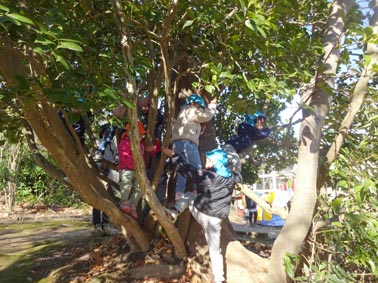 園庭では、思い思いの場所で好きな遊びを。木登りも上達しました。