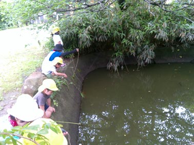 ひまわり組は、ザリガニ釣りへ。雨の後なので、前回より数多く釣り上げることに成功。