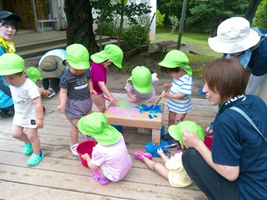 砂場では、2歳児が泥水遊び。砂と水の感触が気持ち良さそうでした。