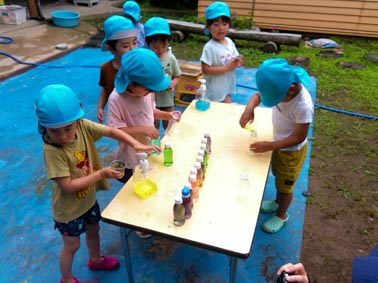すみれ組は、色水の調合。色と量を調節しながら、思い思いの色を作り出していました。