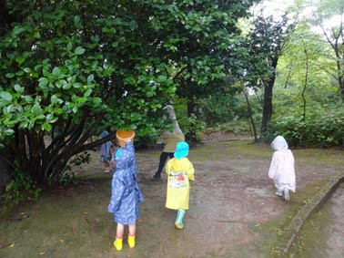 ・外は雨模様。合羽を着こんで、雨水集めへ出発。どこで雨水が多くとれるかを探索中です。