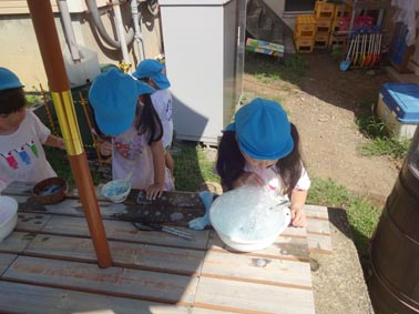 昨日、自分たちで作った石鹸を泡立て感触を楽しみます。