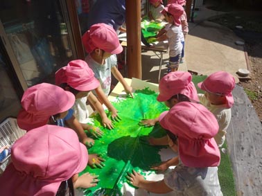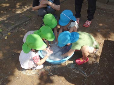 つくし組は、朝顔を使って色水作り。久しぶりの水の感触が、気持ち良さそうです。