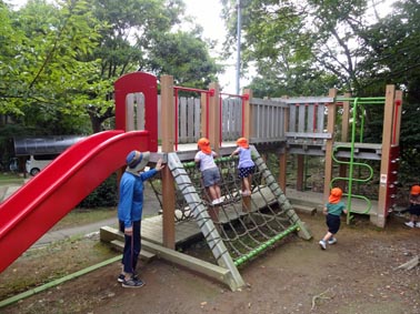 ・涼しい間に、外遊びへ出発。園庭では、久しぶりに滑り台へ。