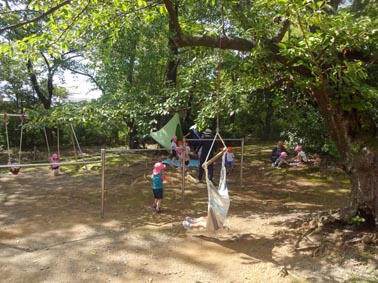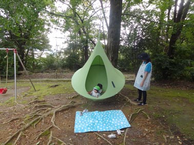 園庭では心地よい風の中、思い思いの場所で遊びに集中しています。