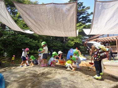 ・つくし組は、砂山で工事中。大きなスコップも上手に使えるように。