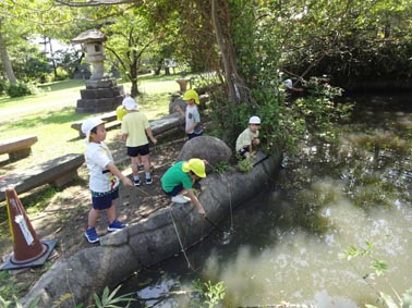 ひまわり組は、ザリガニ釣りへ。春に比べ釣りの腕も上達。たくさんのザリガニを釣り上げました