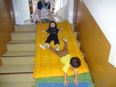 階段にマットを引いての滑り台。いつもと違う滑り台に子どもたちも大喜び。