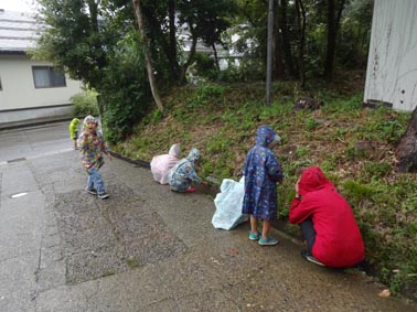 外では合羽に身を包み、雨の日お散歩。水の流れに葉っぱを流し、どこまで行くのか追跡中。