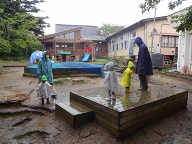 1歳児は、雨が降る音、足でピチャピチャならす音などを楽しんでいました。