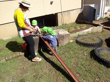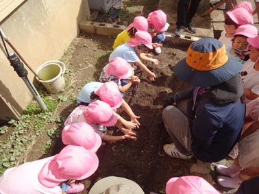 園の畑では、大根の種まきが。大きな大根が収穫できるでしょうか。