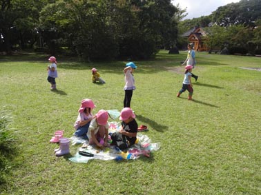 園へ戻ってきて、各クラスいつもと違う場所で楽しみにしていたお弁当タイム。