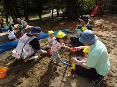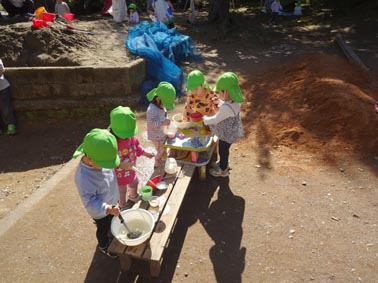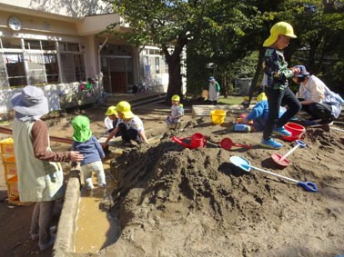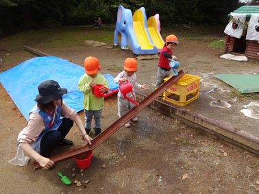 ・今日の園庭では、水の使用量がアップ。砂場に水を入れ、工事の開始。