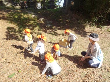 境内では、落ち葉遊び。落ち葉のシャワーや段ボールに詰めたり。これから落ち葉の季節、落ち葉を楽しみたいと思います。