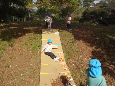 境内では、坂を利用しての段ボール滑り台。途中に落ち葉を置いて、落ち葉ダイブ。