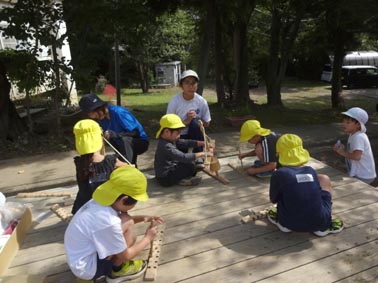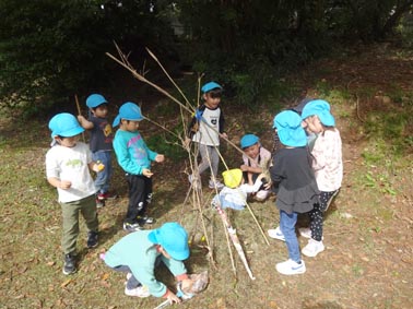 別の場所では、木を組み立ててテント作り。落ち葉も敷き詰め、ふたば組さんをご招待。