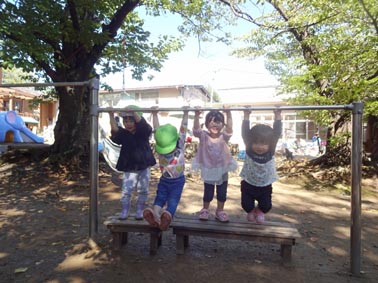 大きい鉄棒にも挑戦のつくし組。楽しそうに、ぶら下がったり、揺れたりしていました。