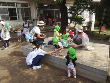 1歳児も水の中へ。そのわきでは、木の実や葉っぱを入れてジュース作り。手つきも手慣れたものになっています。