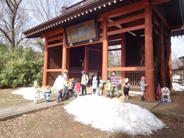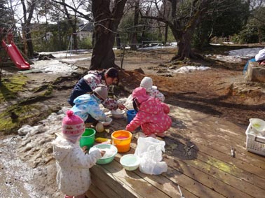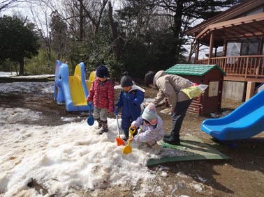 ・暖かい日がつつき、園庭の雪も少なくなってきました。