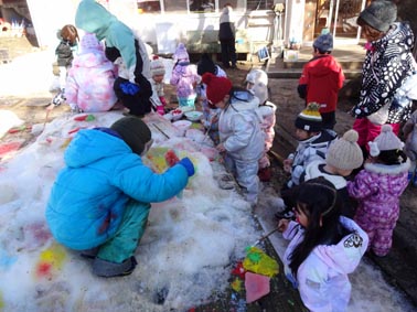 厚い池の氷をとってもらい、園まで運んで色付けを楽しみます。