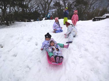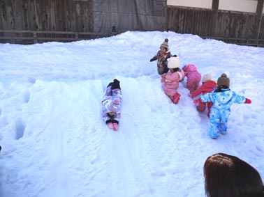 長い斜面でのそり遊びも上達。年長児が1歳児と上手に滑っていました。